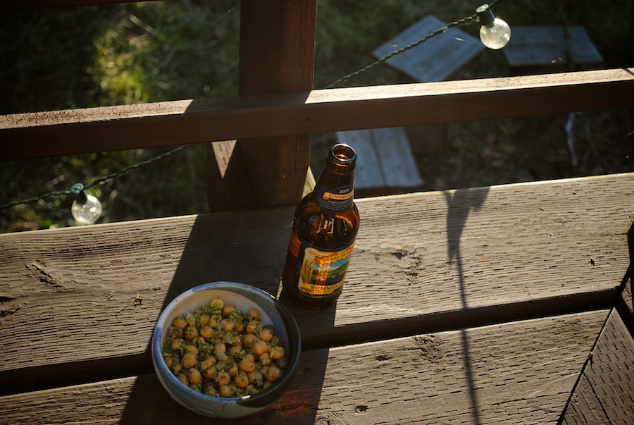 This pesto recipe is a great go-to for a garden bounty, or to save the bunch in your fridge from dying early in the compost. A much cheaper, brighter version of the traditional basil pesto, it will make a summer salad or pasta more interesting, with a much longer season. Instead of garlic, I used the milder, early-summer garlic scapes from my CSA, along with toasted almonds. It went perfectly over a chickpea salad drowned in mint and lemon (and two and a half beers).