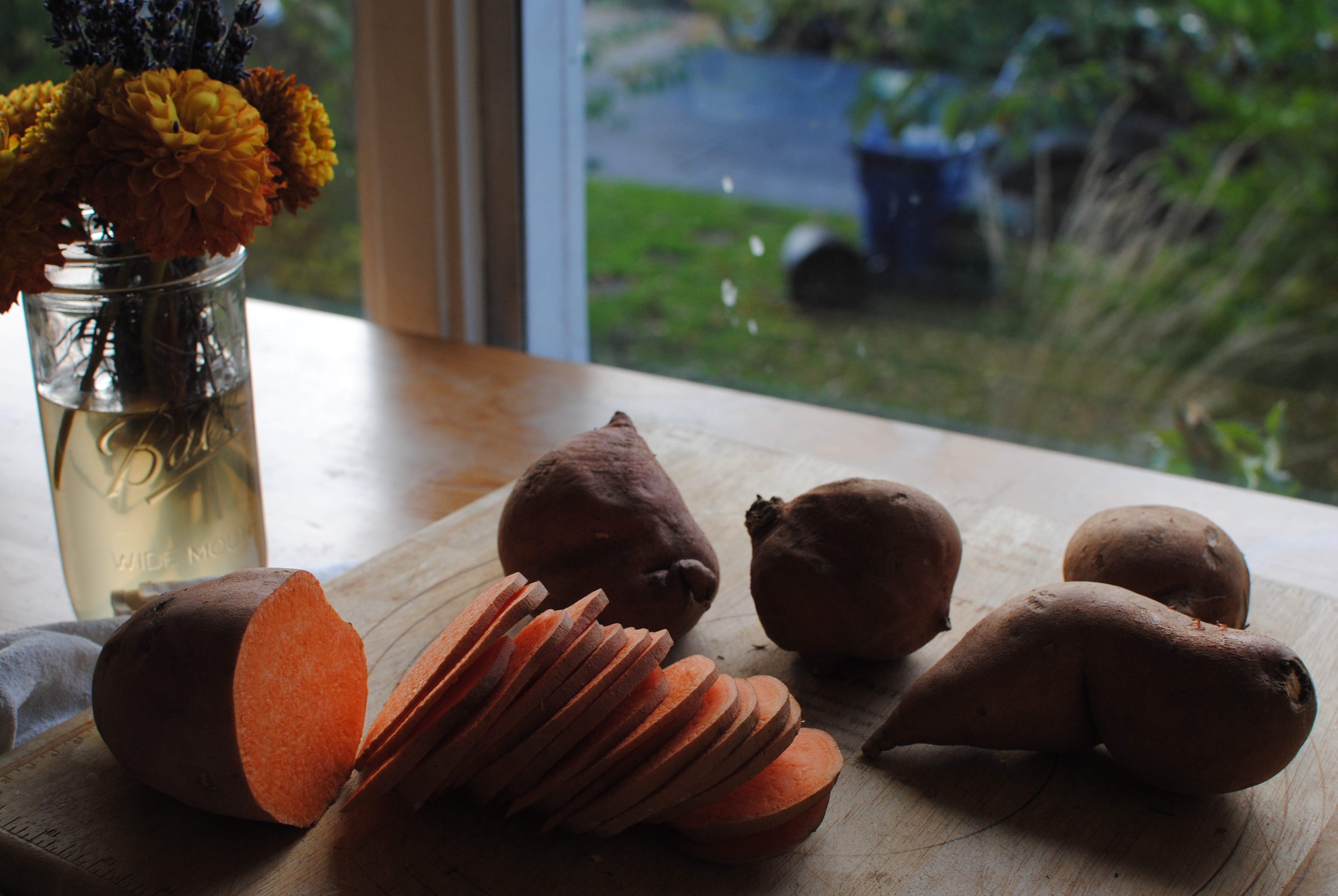 - Slice sweet potatoes into 1/8-inch thick rounds (I kept the skins on, but you can remove if you like).