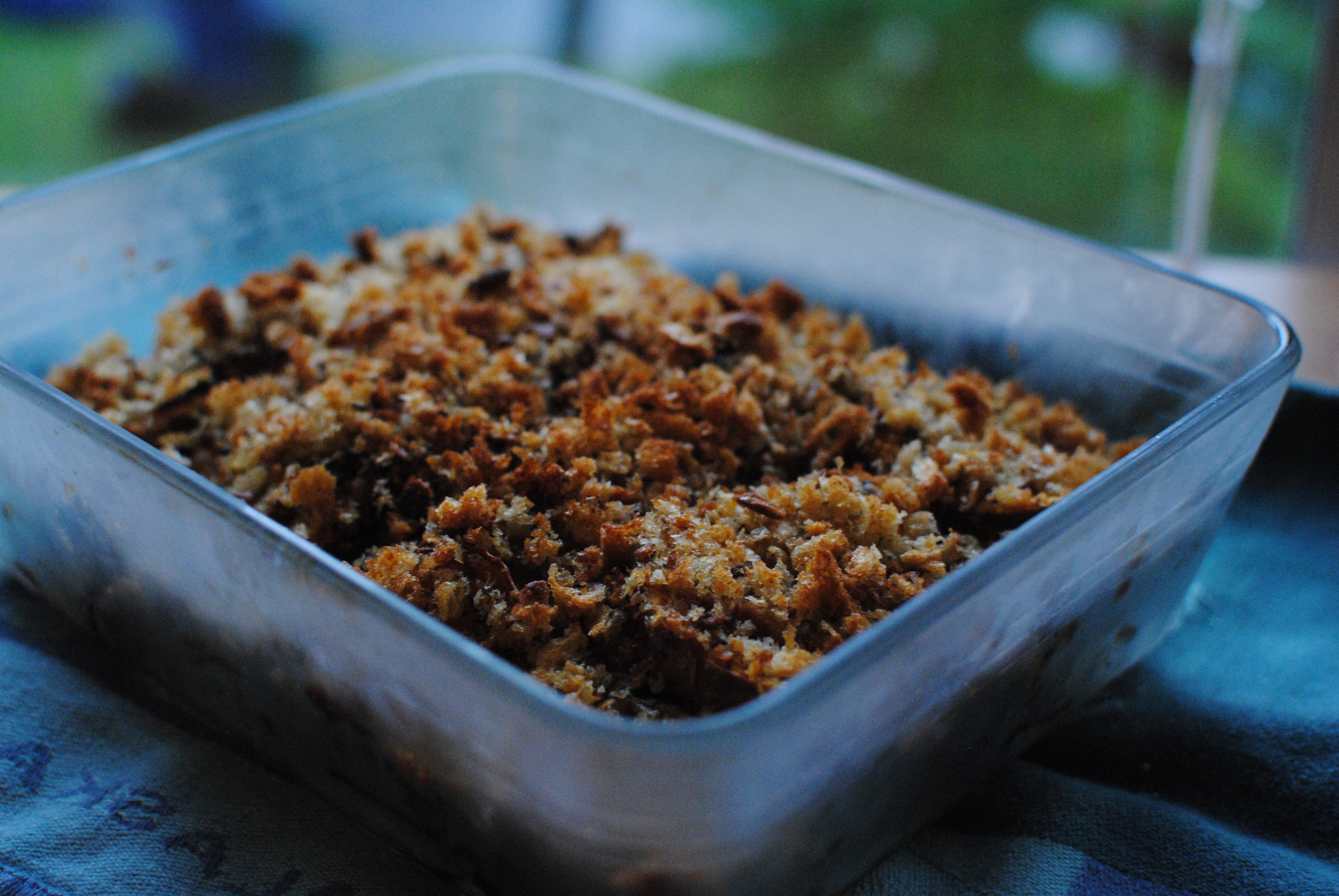 - 1 1/2 cups breadcrumbs (stale bread torn into 1-inch cubes, drizzled with olive oil and salt, lightly toasted, and blended in a food processor)
