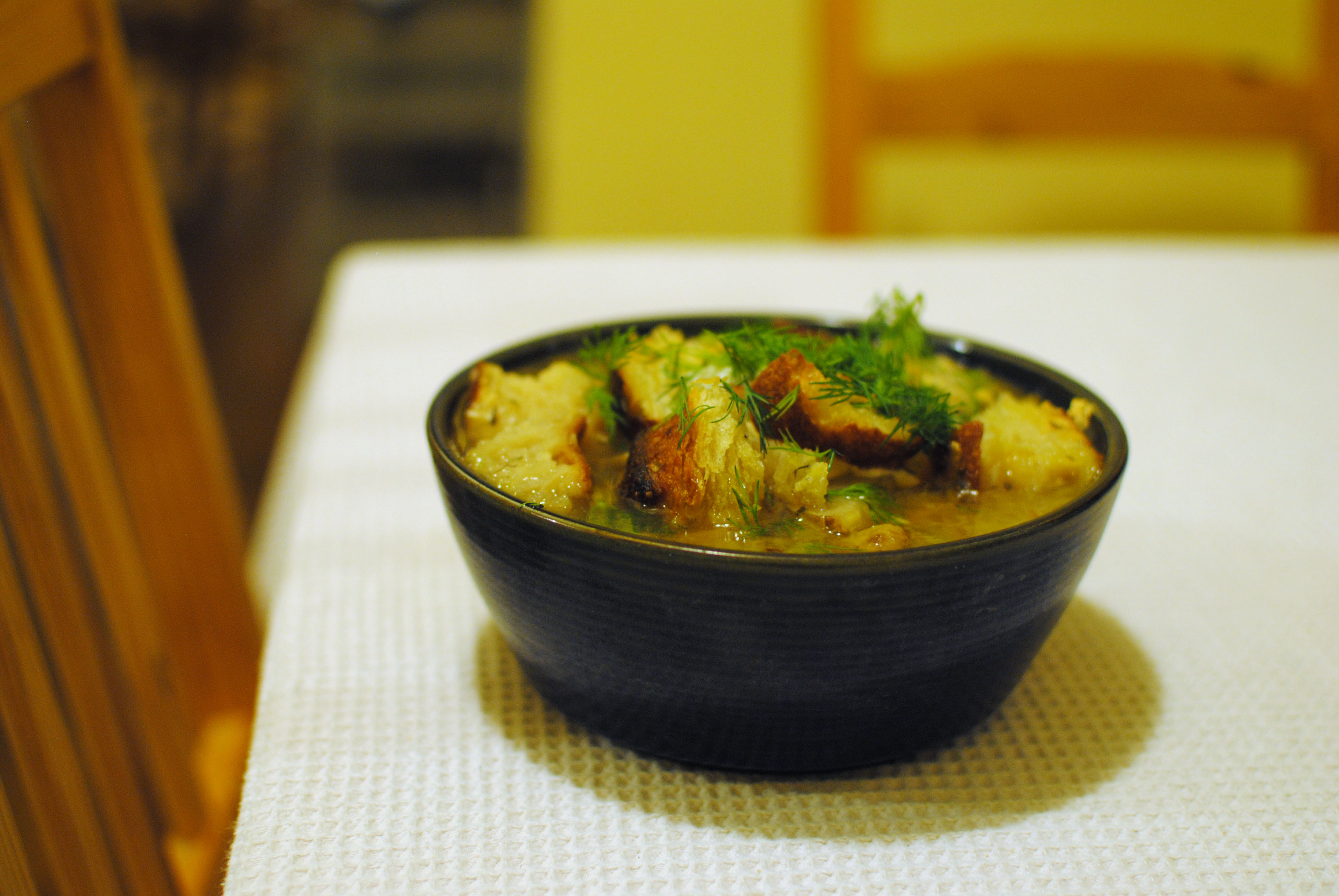 When I came upon my root medley remnants, I found a handful of turnips and sunchokes — the often overlooked members of the root family. Anna and I only recently started experimenting with turnips, and the mild sweetness that releases after they’re cooked seemed like a nice combination with the earthy sunchokes. Caraway seed and a splash of white wine made for a bright and delightfully sour soup, perfect for a suddenly rainy spring night.