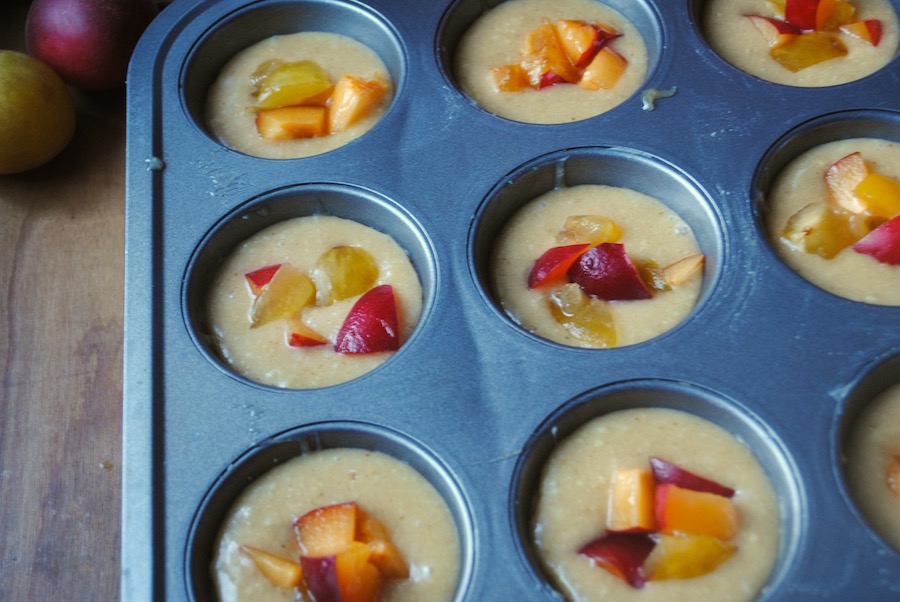 - Pour about 1.5 T of batter in each muffin tin–for regular sized tins, this will be a little more than halfway (more than this, and they will come out mushy), and top with diced fruit.