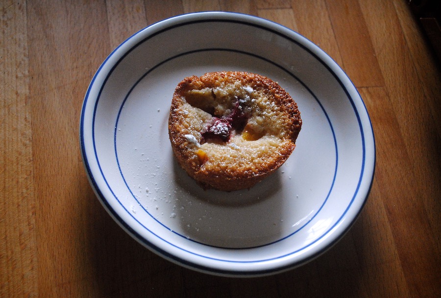 But these cakes are also the most sophisticated, most delicious thing you could make with leftover egg whites I can think of. I used up my piling fruit CSA in the process, dotting each muffin tin with small chunks of nectarines and plums.